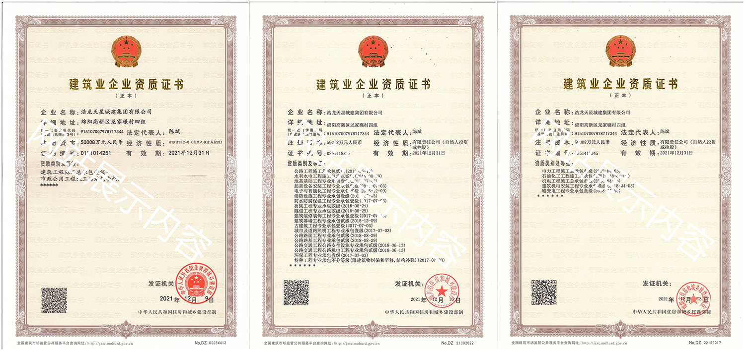 浩龍?zhí)煨浅墙瘓F(tuán)有限公司,2007年成立于“李白故鄉(xiāng)、中國科技城”—四川省綿陽市,企業(yè)注冊(cè)資本金5.0008億元。公司共有27項(xiàng)建筑業(yè)企業(yè)資質(zhì),其中國家一級(jí)資質(zhì)11項(xiàng),二級(jí)資質(zhì)10項(xiàng),三級(jí)資質(zhì)5項(xiàng),特種資質(zhì)不分等級(jí)1項(xiàng),類別涵蓋建筑、市政、水利、機(jī)電、隧道、起重設(shè)備安裝等基礎(chǔ)及未來發(fā)展重點(diǎn)專業(yè)。公司...